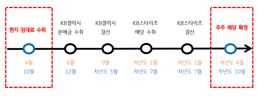 ② KB스타갤럭시타워리츠: 매년 6월과 12월에 벨기에 현지법인으로부터 배당금 수령 후 결산 과정을 거쳐, 매년 1월과 7월에 KB스타리츠로 배당금 지급