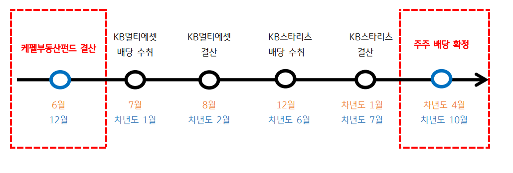 ② KB스타멀티에셋리츠: 매년 1월과 7월에 케펠부동산펀드로부터 배당금 수령 후 결산 과정을 거쳐, 매년 6월과 12월에 KB스타리츠로 배당금 지급