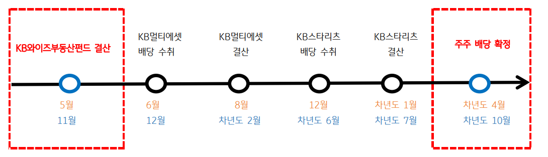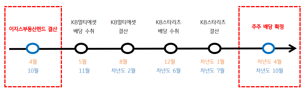 ② KB스타멀티에셋리츠: 매년 5월과 11월에 이지스부동산펀드로부터 배당금 수령 후 결산 과정을 거쳐, 매년 6월과 12월에 KB스타리츠로 배당금 지급③ KB스타리츠: 매년 6월과 12월에 KB스타멀티에셋리츠로부터 배당금 수령 후 결산 과정을 거쳐, 매년 10월과 4월에 배당금이 확정