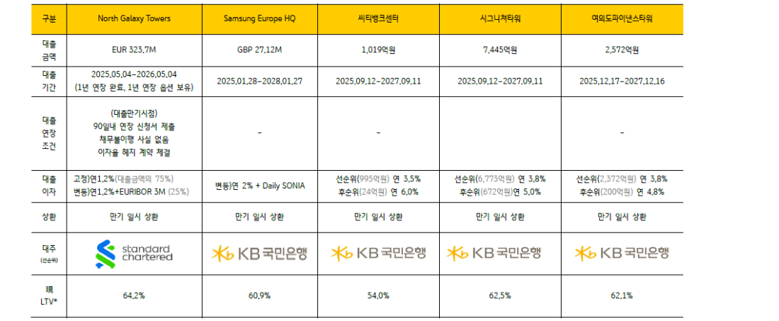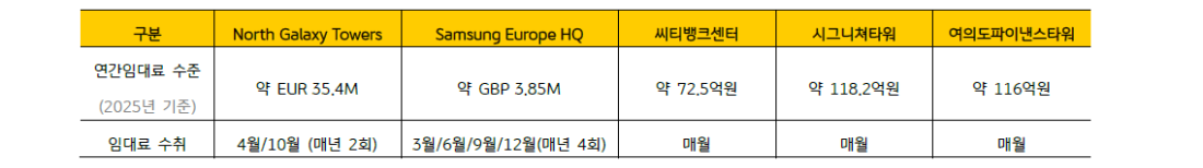 영국 자산(Samsung Europe HQ) 및 국내 자산(씨티뱅크센터, 시그니쳐타워, 여의도파이낸스타워)로부터 창출되는 임대 수익금입니다.