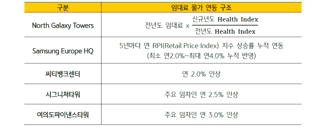- 국내 자산의 임대료는 각 임차인 임대차 계약서에 의해 매년 2.0%~3.0% 인상됩니다.