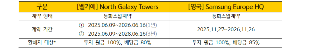 - KB스타리츠의 해외자산은 다음과 같이 환헤지 계약을 체결하여 해외자산의 환율 변동위험을 최소화 하였습니다.