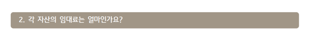 - 각 자산 별 연간 임대료 수준은 다음과 같습니다.